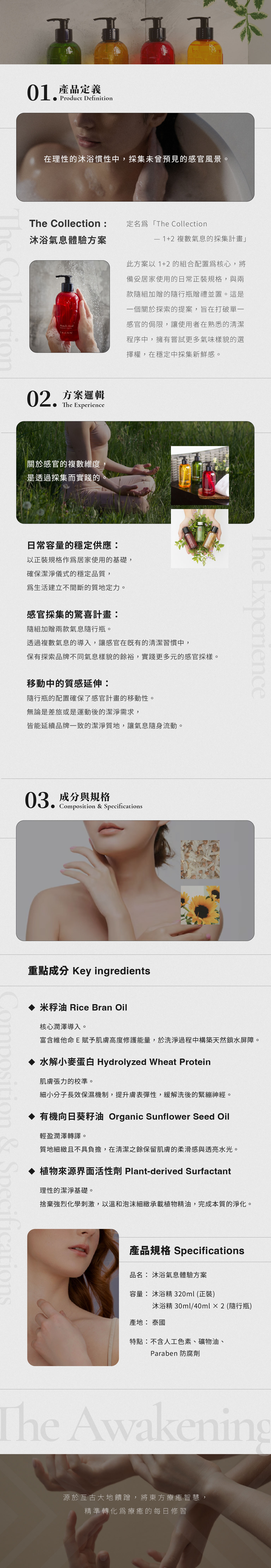 正裝瓶 用於日常的清潔頻率,並輔以兩款小容量的氣息體驗。這是一個關於「感官採集」的配置,讓沐浴儀式在穩定的慣性與新鮮的氣味體驗之間,豐富洗沐體驗。