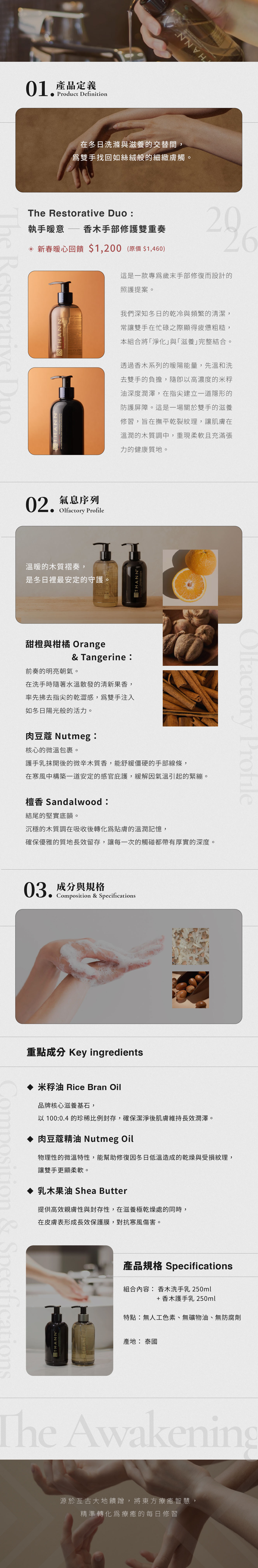 香木系列將甜橙的活力與檀香的沉穩揉合,在洗手乳洗去整日奔波後,隨即以護手乳封存那份指尖的溫潤。讓每一場執手,都帶著大地溫煦的記憶,展現最體面的社交風範。