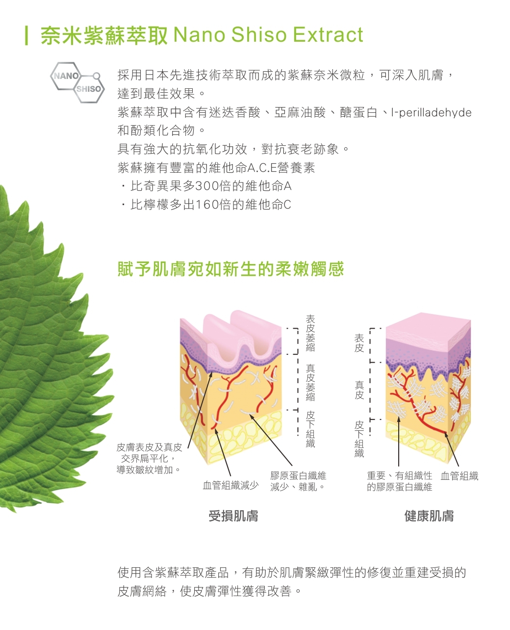 ◆ 紫蘇萃取:可平滑細紋、緊緻肌膚,舒緩和軟化敏感肌膚。