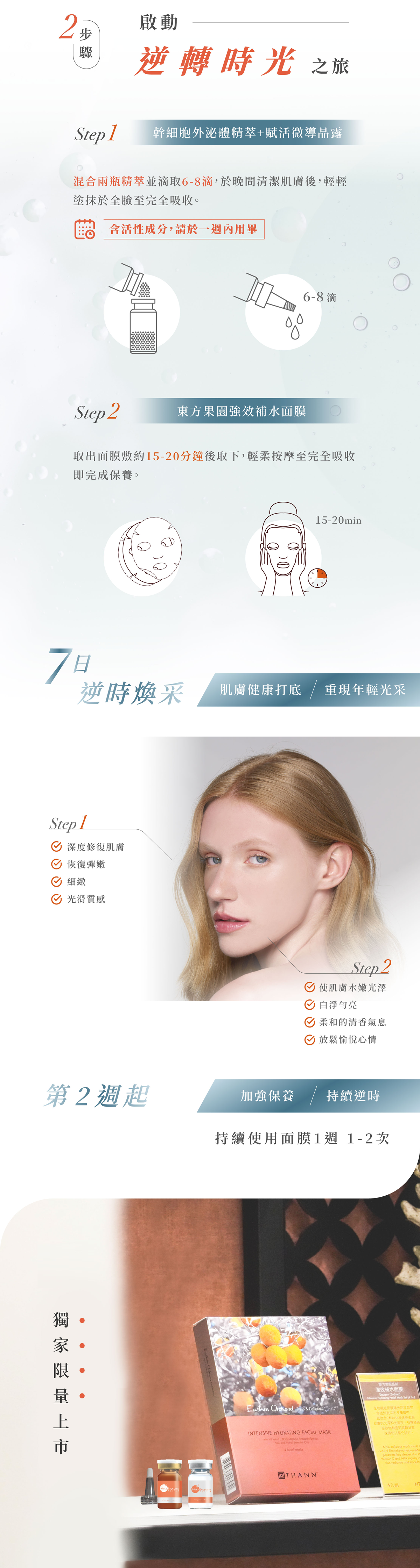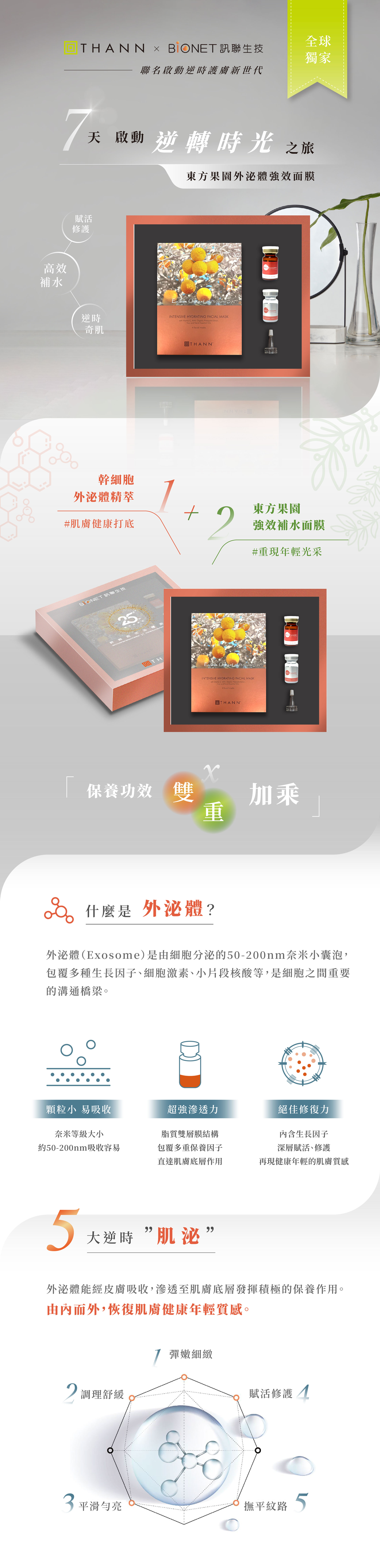 ▶本組合包含:東方果園外泌體強效面膜禮盒(含幹細胞次世代外泌體精萃x1+面膜x4入)+ 東方果園密集補水面膜組(面膜x4入),共8入面膜(原價$3,260)