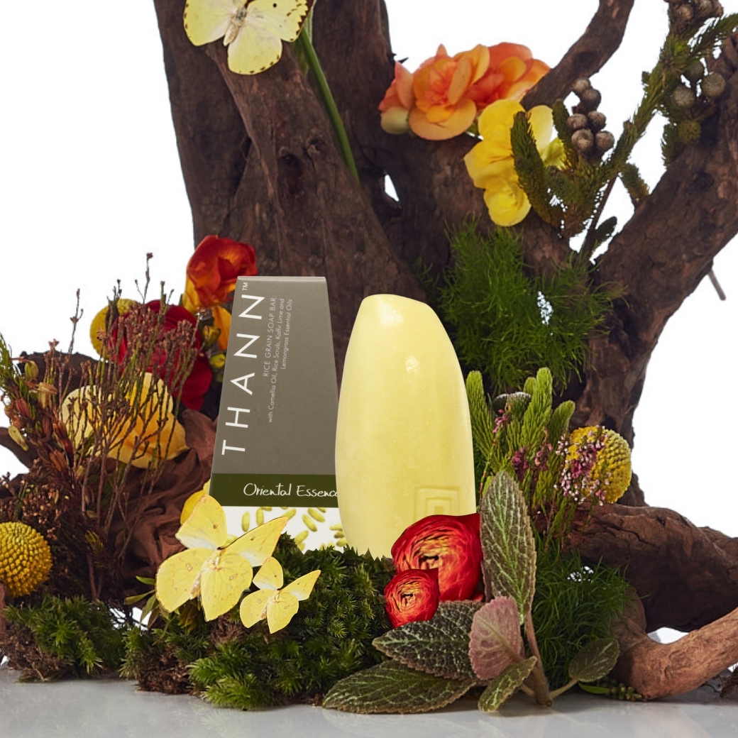 富含 Omega-9 的山茶花油和富含維他命 E 的米稃油可滋潤肌膚。米殼粉末可以溫和去角質,徹底清潔肌膚。異國情調的青檸和檸檬草精油混合可舒緩身心,促進安眠。