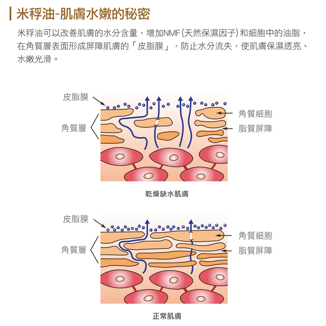 系列富有高含量「米稃油」。米稃油富含必需脂肪酸、維他命E,能在肌膚上形成保護膜,防止水分流失,抗氧化預防肌膚老化,是THANN以此為名的品牌明星成分。