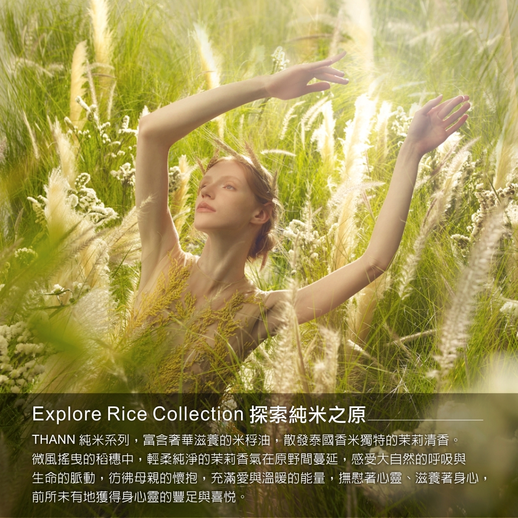 系列富有高含量「米稃油」。米稃油富含必需脂肪酸、維他命E,能在肌膚上形成保護膜,防止水分流失,抗氧化預防肌膚老化,是THANN以此為名的品牌明星成分。