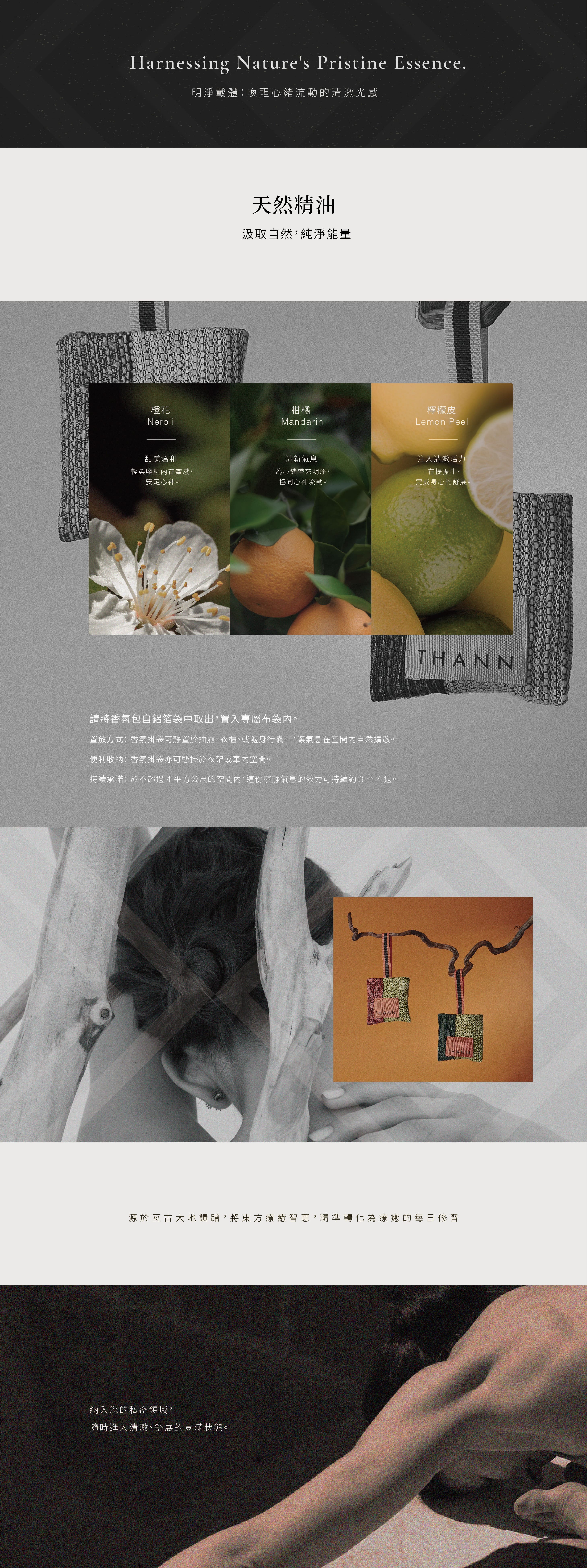 使用方式:取下鋁箔袋後,將香氛包置於衣櫃、行李箱或車內等空間 。這份靜謐之息適用於約 4 平方公尺的空間 ,成為你追求靜謐生活中的微型氣息定錨 。